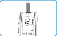 3. While " " is flashing on the display, touch the absorbent hole on the tip of the test strip to the drop of blood until the confirmation window is completely filled. |