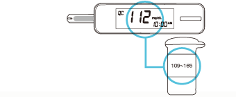 2.Perform a control solution test: Insert the test strip to turn on the meter, and press the button to mark this test as a control solution test with QC displayed. Apply the control solution and compare result with the range printed on the test strip vial. The result displayed on the screen should fall within the range. |
